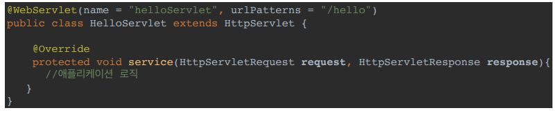 - urlPatterns의 URL이 호출되면 서블릿 코드가 실행 - HTTP 요청 정보를 편리하게 사용할 수 있는 HttpServletRequest - HTTP 응답 정보를 편리하게 제공할 수 있는 HttpServletResponse - 개발자는 HTTP 스펙을 매우 편리하게 사용할 수 있다. 2) HTTP 요청, 응답 흐름 - HTTP 요청 시, WAS에서는 Request, Response 객체를 새로 만들어서 서블릿 객체를 호출 - 개발자는 Request 객체에서 HTTP 요청 정보를 편리하게 꺼내서 사용 - 개발자는 Response 객체에 HTTP 응답 정보를 편리하게 입력 - WAS는 Response 객체에 담겨있는 내용으로 HTTP 응답 정보를 생성 - 서블릿 컨테이너에서는 서블릿의 생성과 호출을 관리한다.