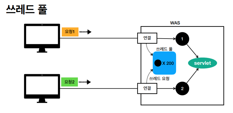 2) 다중 요청 - 쓰레드 하나만 사용 - 다중 요청이 들어올때, 하나의 쓰레드만을 사용하게 되면 요청1이 들어와서 처리 중이면 요청 2는 쓰레드를 대기하고 있으여하므로 처리가 지연된다. 3) 다중 요청 - 요청 마다 쓰레드를 생성 - 요청이 들어올 때마다 쓰레드를 생성할 경우 리소스(CPU, 메모리)가 허용할 때까지 처리가 가능하다. - 동시 요청을 처리할 수 있으며, 하나의 쓰레드가 지원되더라도, 나머지 쓰레드는 정상적으로 동작 - 하지만 쓰레드 생성 비용이 매우 비싸며, 고객 요청이 너무 많을 경우, CPU, 메모리 임계점을 넘어서 서버가 죽을 수 있다. 4) 다중 요청 - 쓰레드 풀 생성 - 요청이 올때마다 쓰레드를 생성해서 처리할 경우 발생할 수 있는 단점을 보안 - 쓰레드를 쓰레드 풀에 보관하고 관리 - 쓰레드가 필요하면, 이미 생성되어 있는 쓰레드를 쓰레드 풀에서 꺼내 사용 - 사용을 종료하면 쓰레드 풀에 해당 쓰레드를 반납 - 최대 쓰레드가 모두 사용중이여서 사용 가능한 쓰레드가 풀에 없다면, 기다리는 요청은 거절하거나 대기할 수 있도록 설정이 가능 - 쓰레드가 미리 생성되어 있으므로, 쓰레드를 생성하고 종료하는 비용(CPU)이 절약되고, 응답 시간이 빠르다. - 생성 가능한 쓰레드의 최대치가 있으므로 너무 많은 요청이 들어와도 기존 요청은 안전하게 처리할 수 있다.