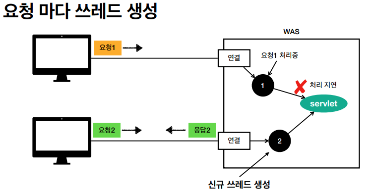 1) 단일 요청 - 쓰레드 하나만 사용 - 단일 요청이 들어오면 하나의 쓰레드가 할당되어 서블릿에게 요청을 보낸다.